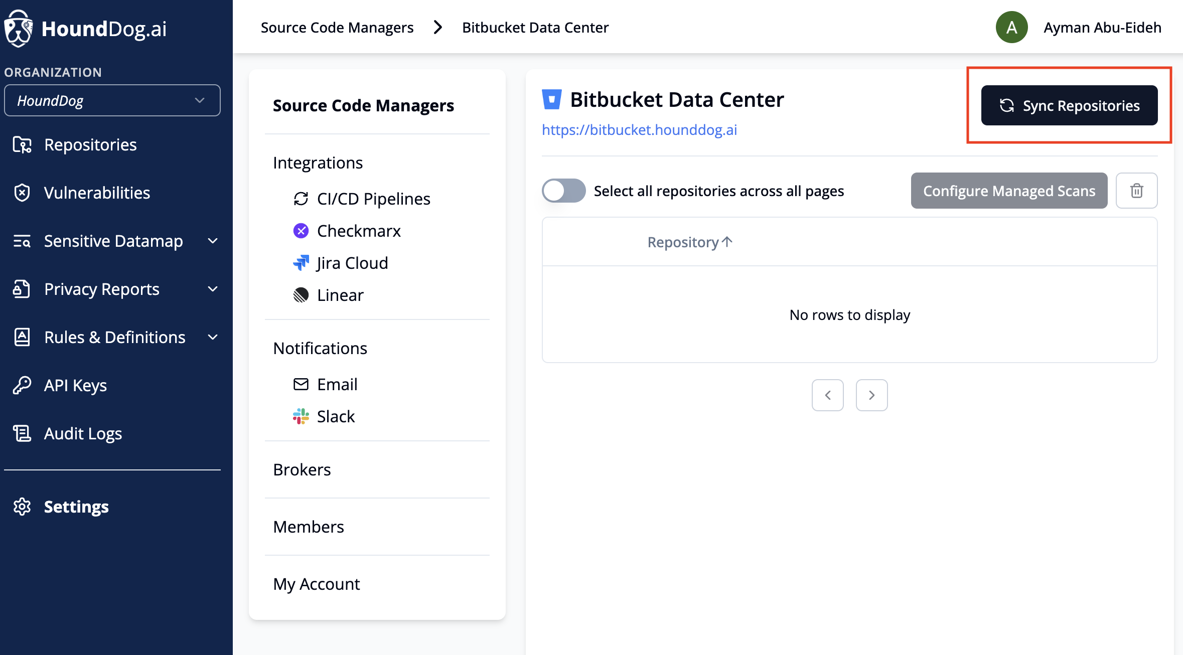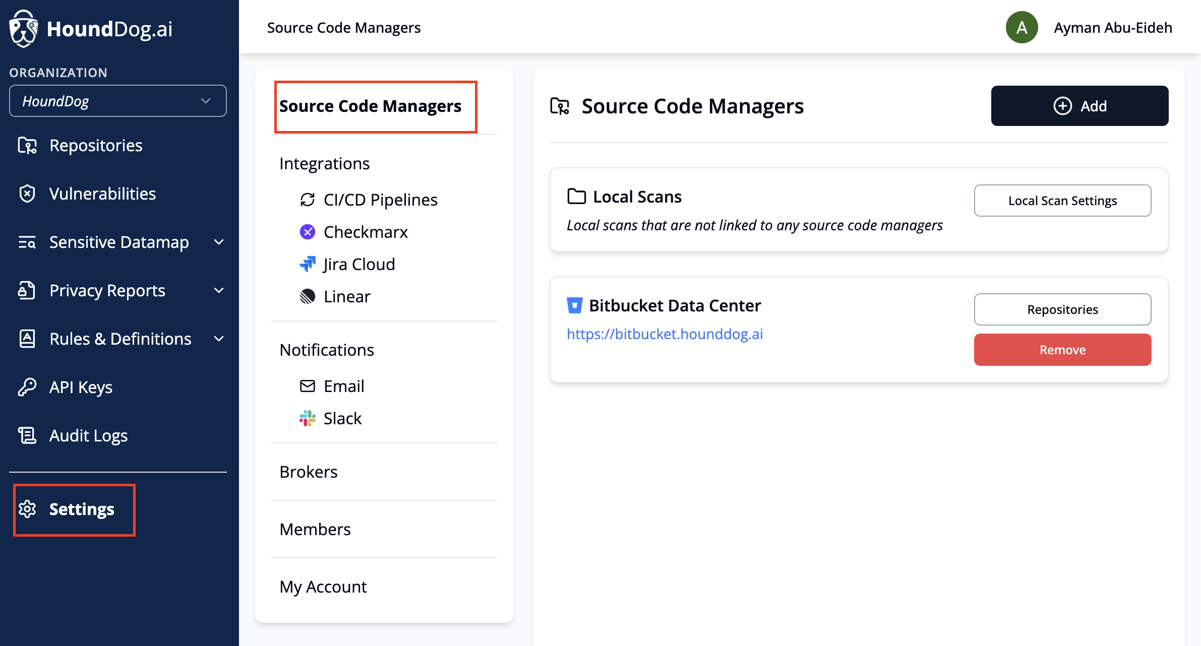 To access it, navigate to Settings > Source Code Managers on the HoundDog.ai dashboard.