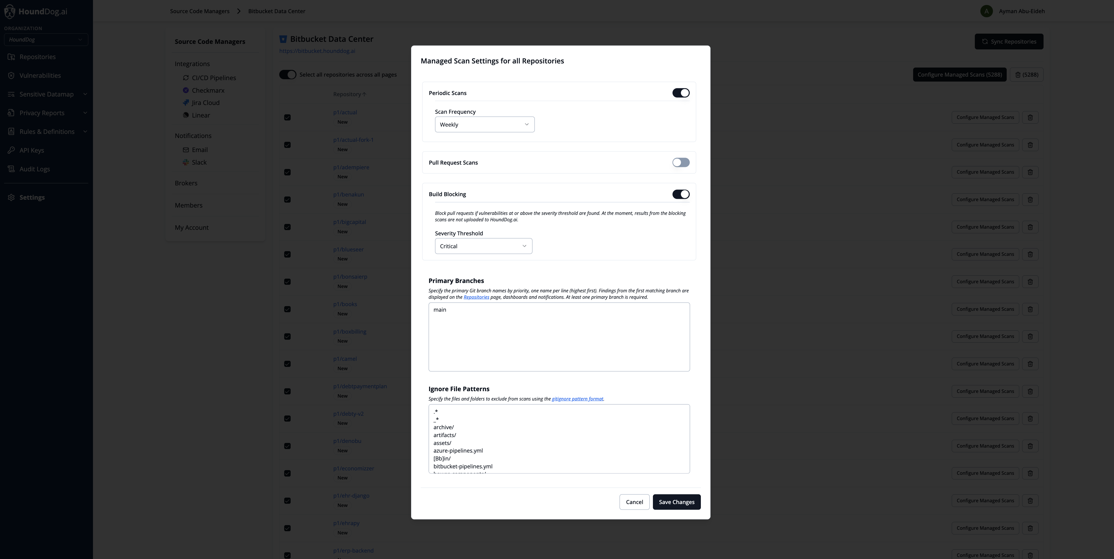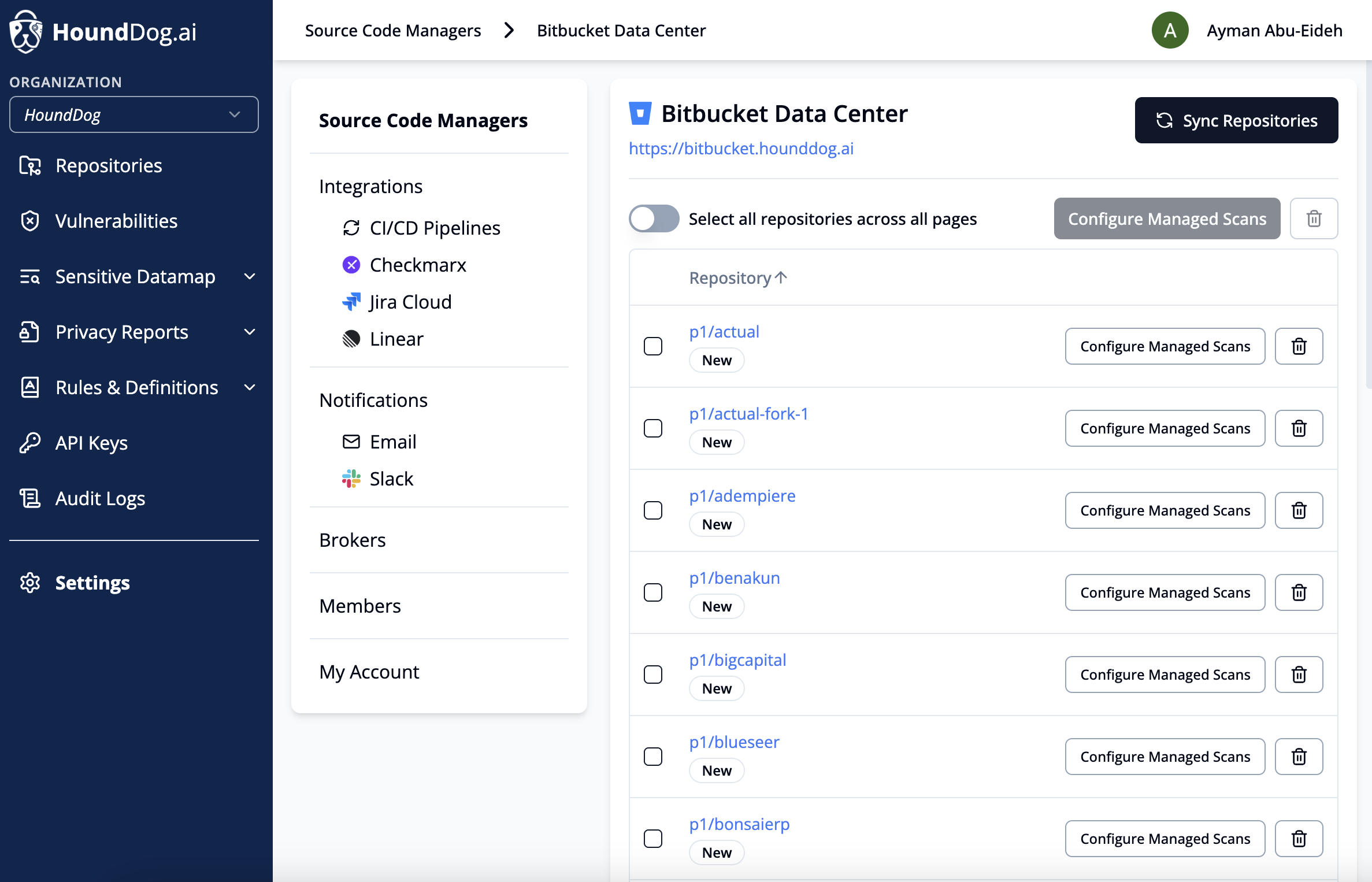 This integration is available as part of the Managed Scans enterprise feature, enabling organizations to offload the scanning of code repositories to HoundDog.ai based on their preferred scan frequency (e.g., daily or weekly).