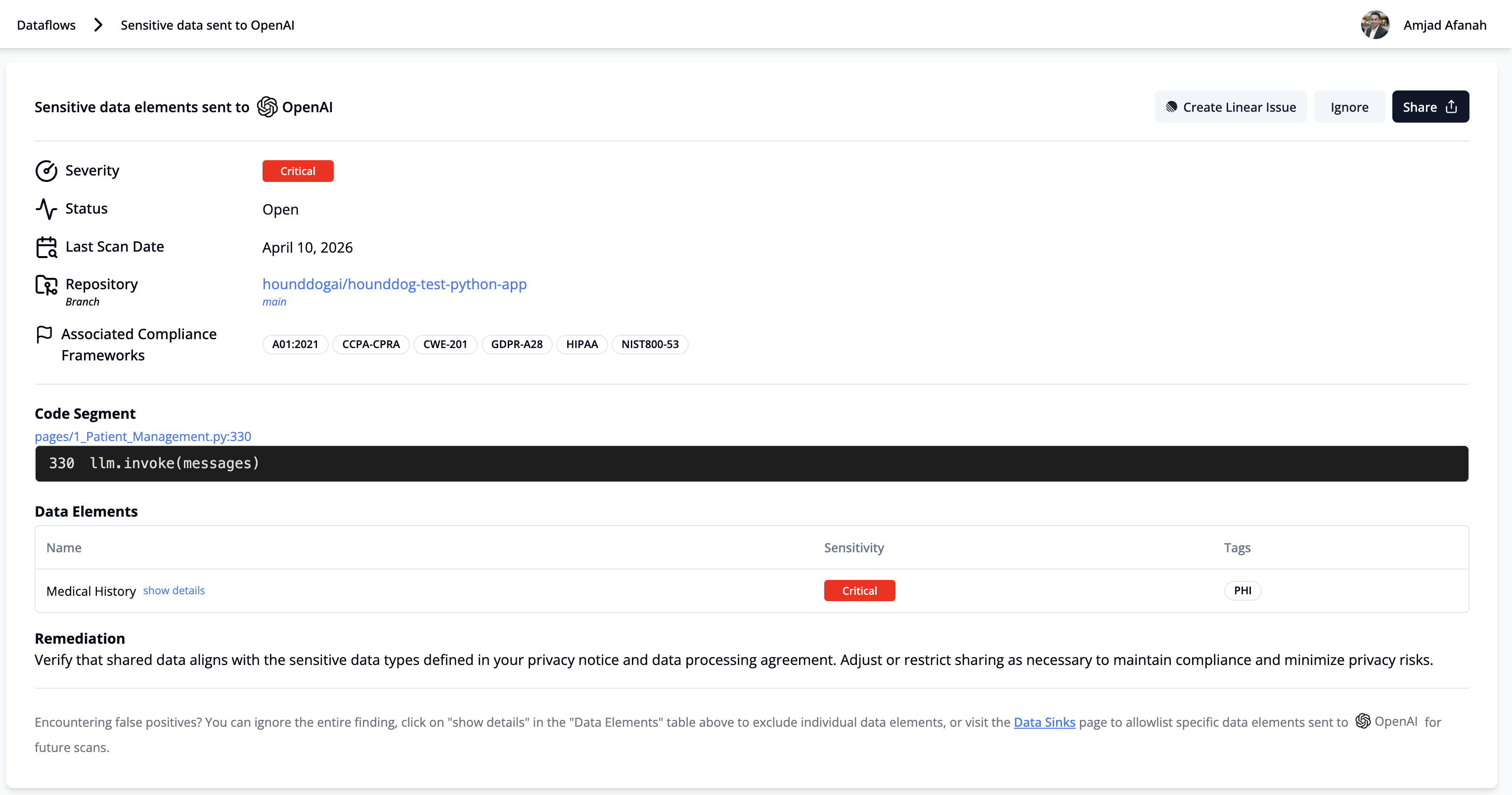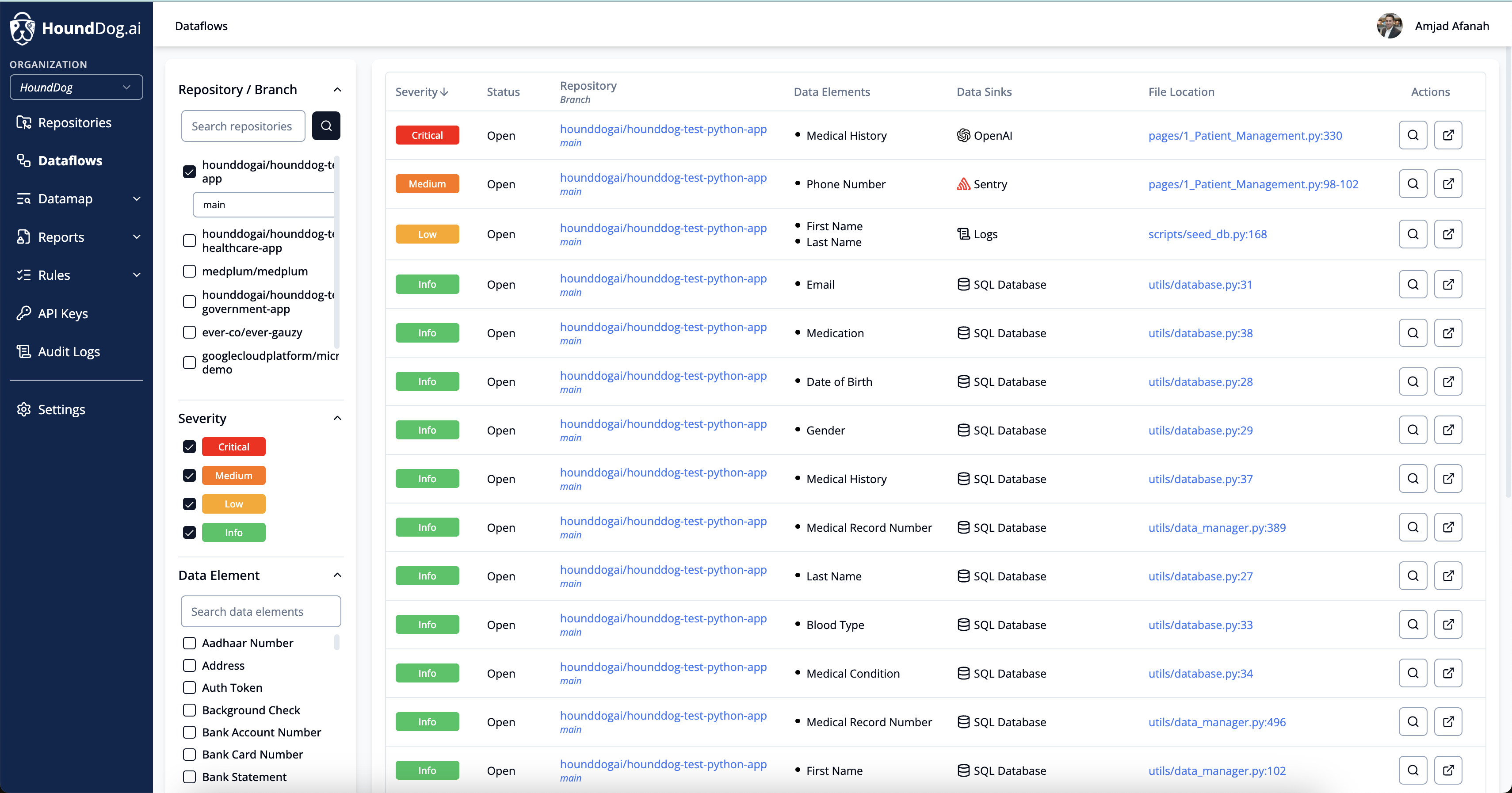 The Dataflows page provides a view of sensitive data flows detected by the HoundDog.ai code scanner. It shows how data moves from your applications to various data sinks, including logs, files, APIs, third party services, and AI integrations, where it may be stored or shared. This creates code level evidence of processing activities, helping you keep privacy reports such as Records of Processing Activities up to date for GDPR, CCPA, and other frameworks.