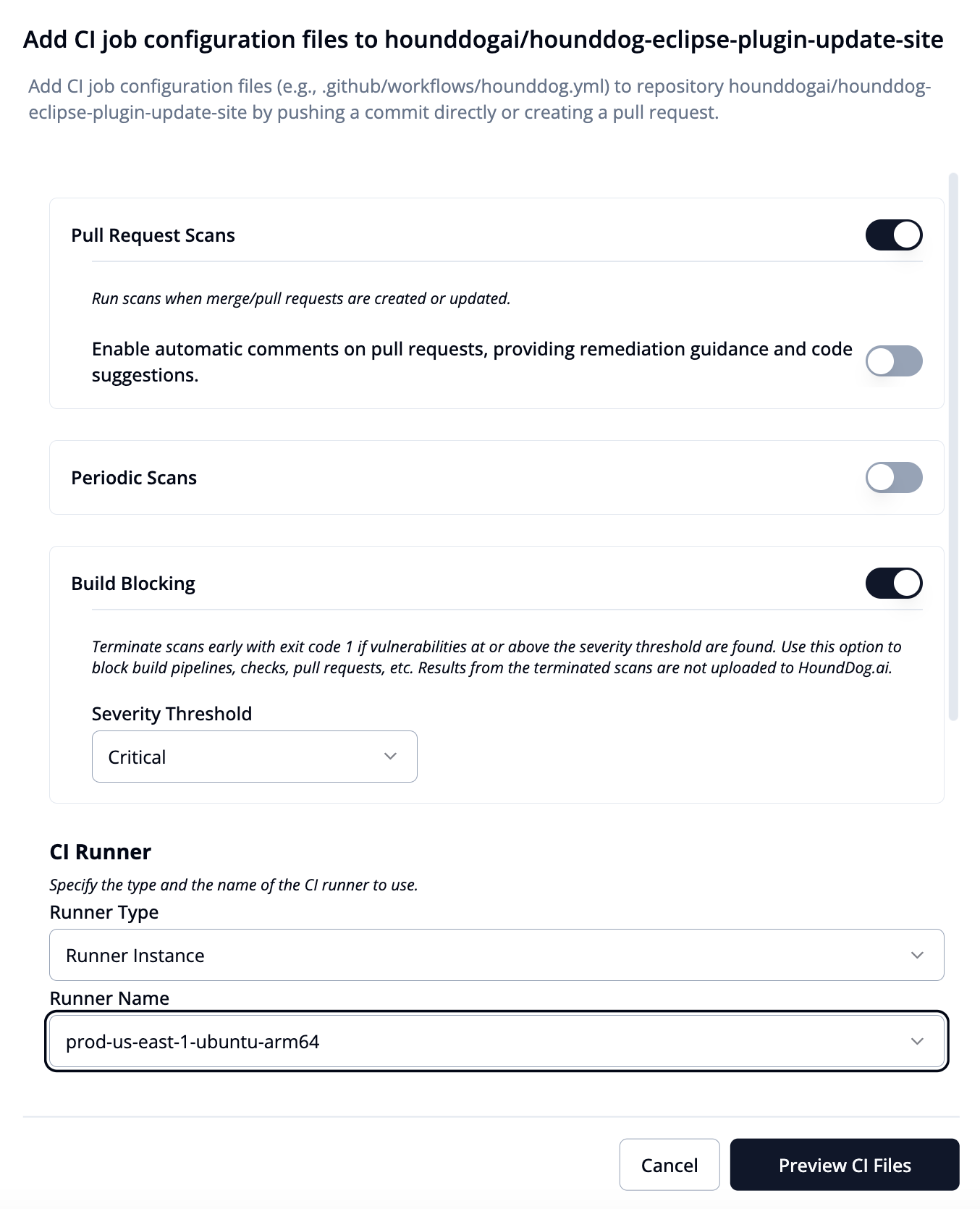 Once you complete the configuration, click Preview CI Files to review the GitHub Actions YAML configuration generated based on your customizations.