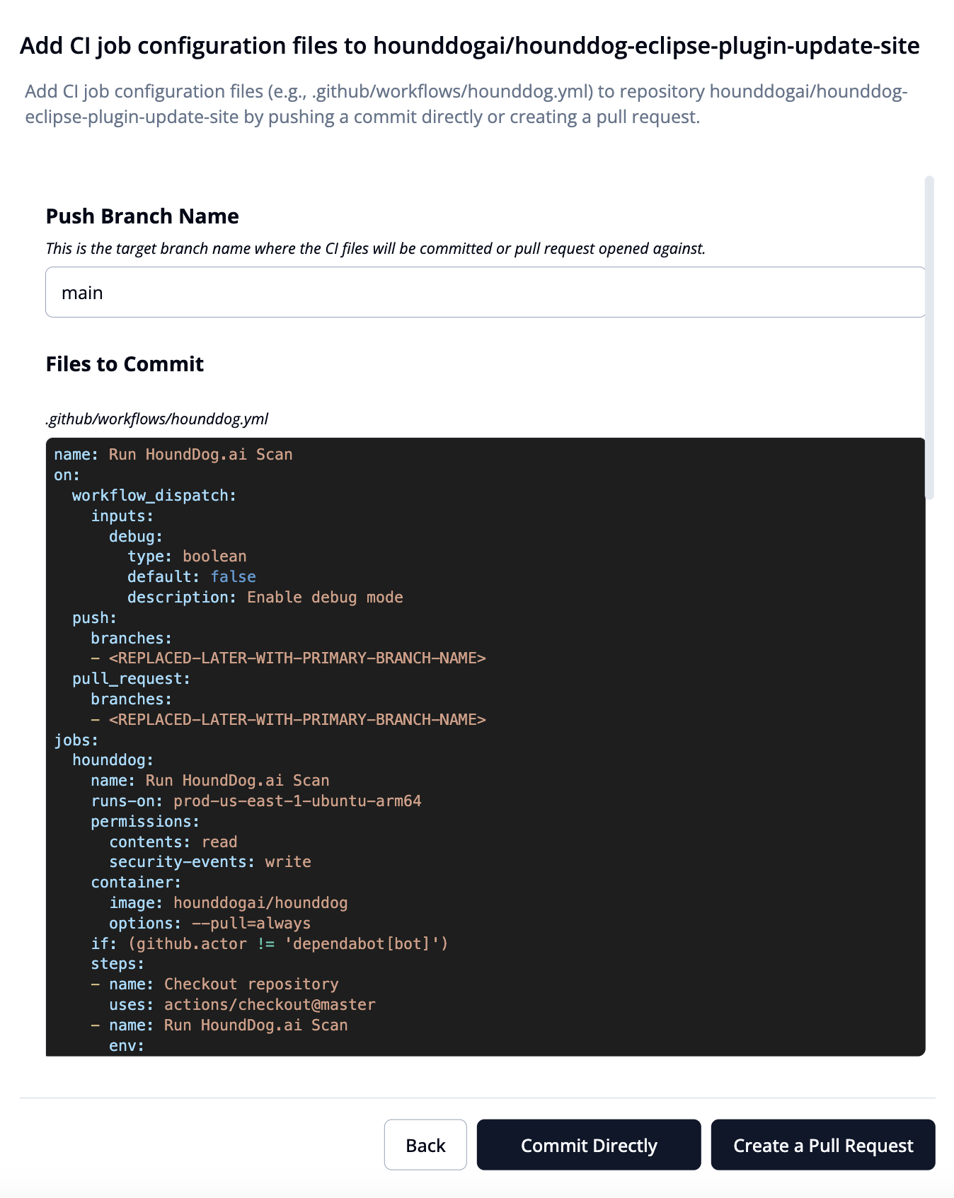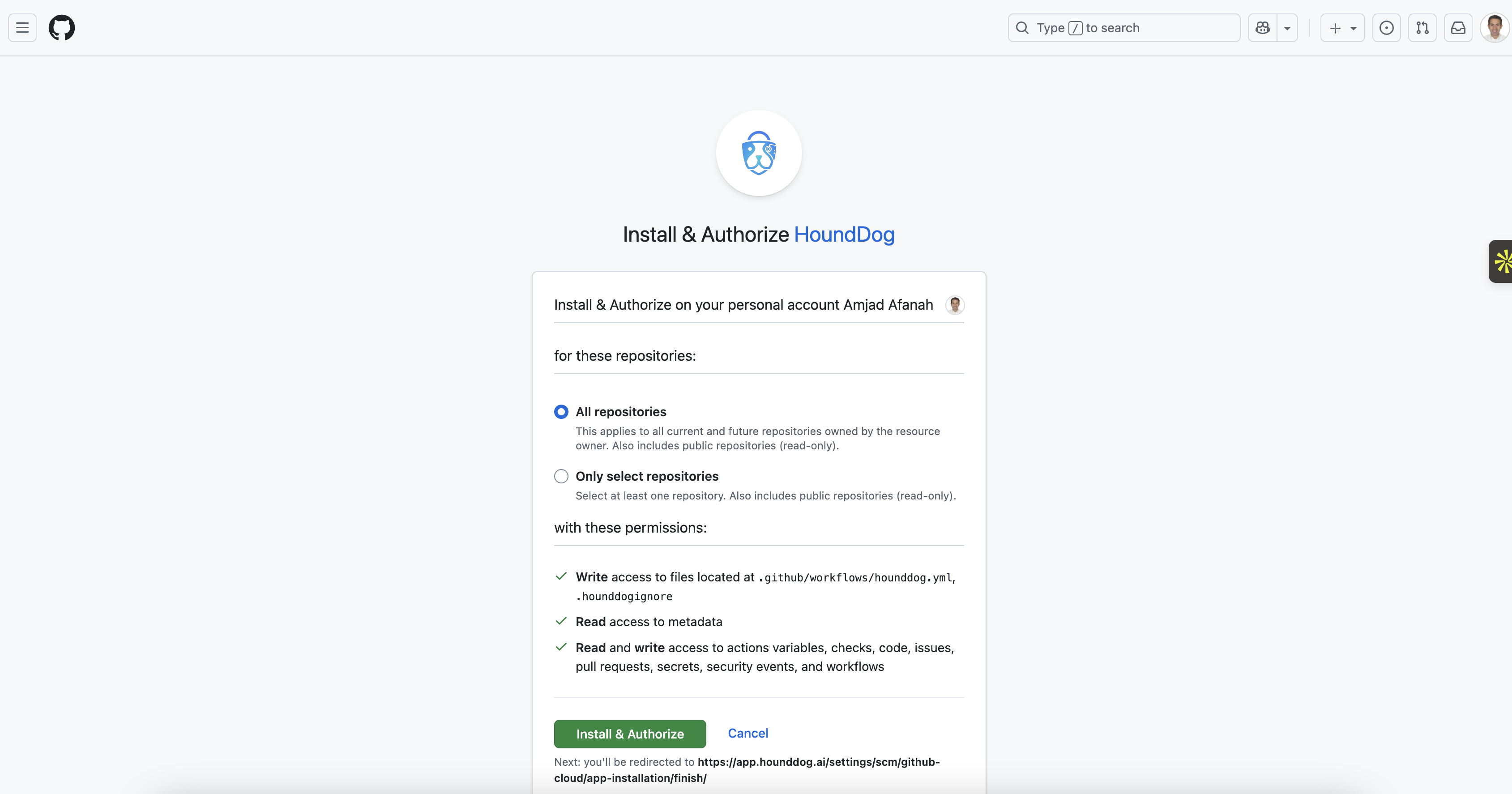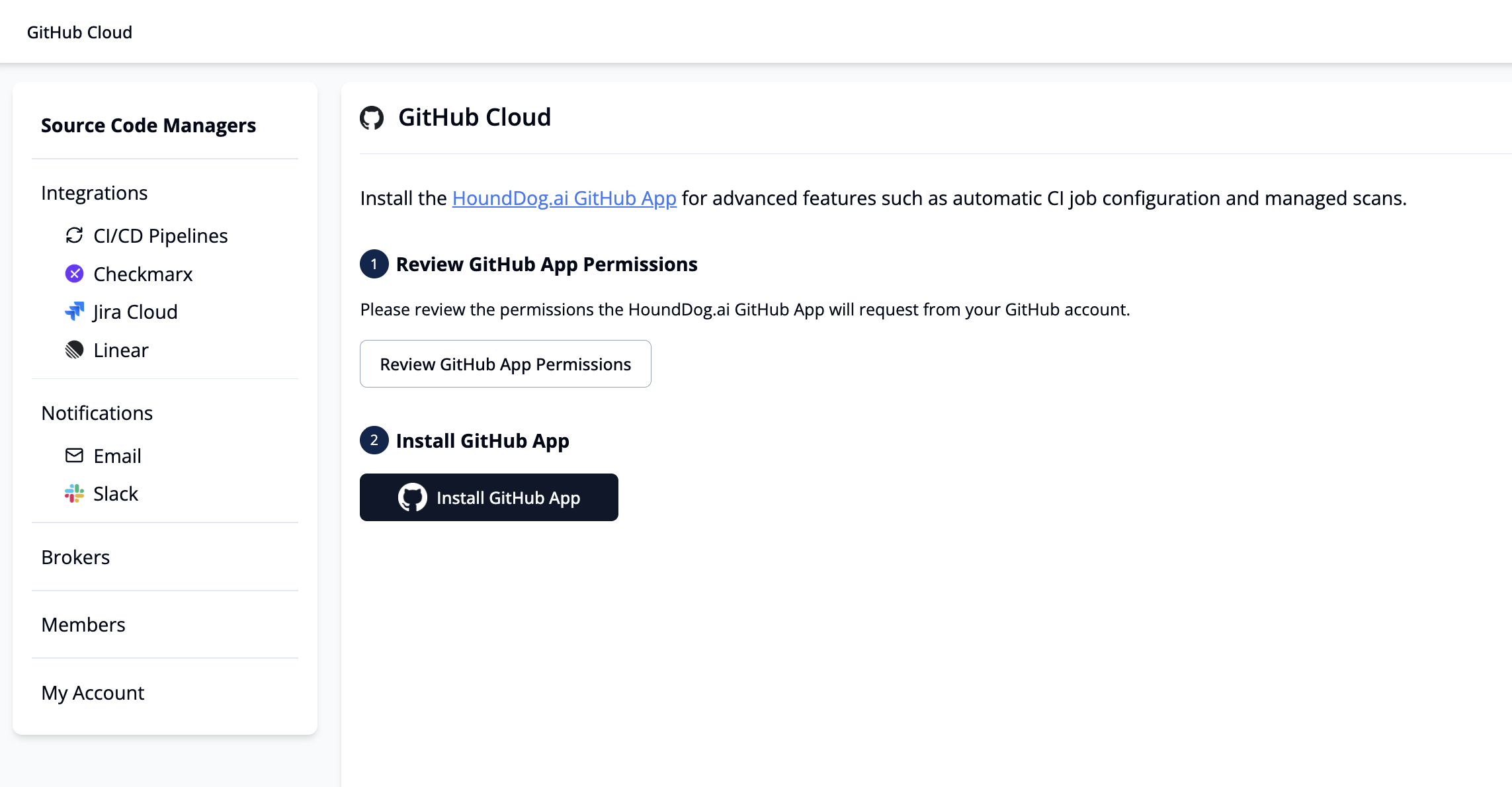 You can install the HoundDog.ai GitHub App for advanced features such as automatic CI job configuration and managed scans. As of October 2025, only automated CI configuration is available for GitHub, with managed scans coming soon.