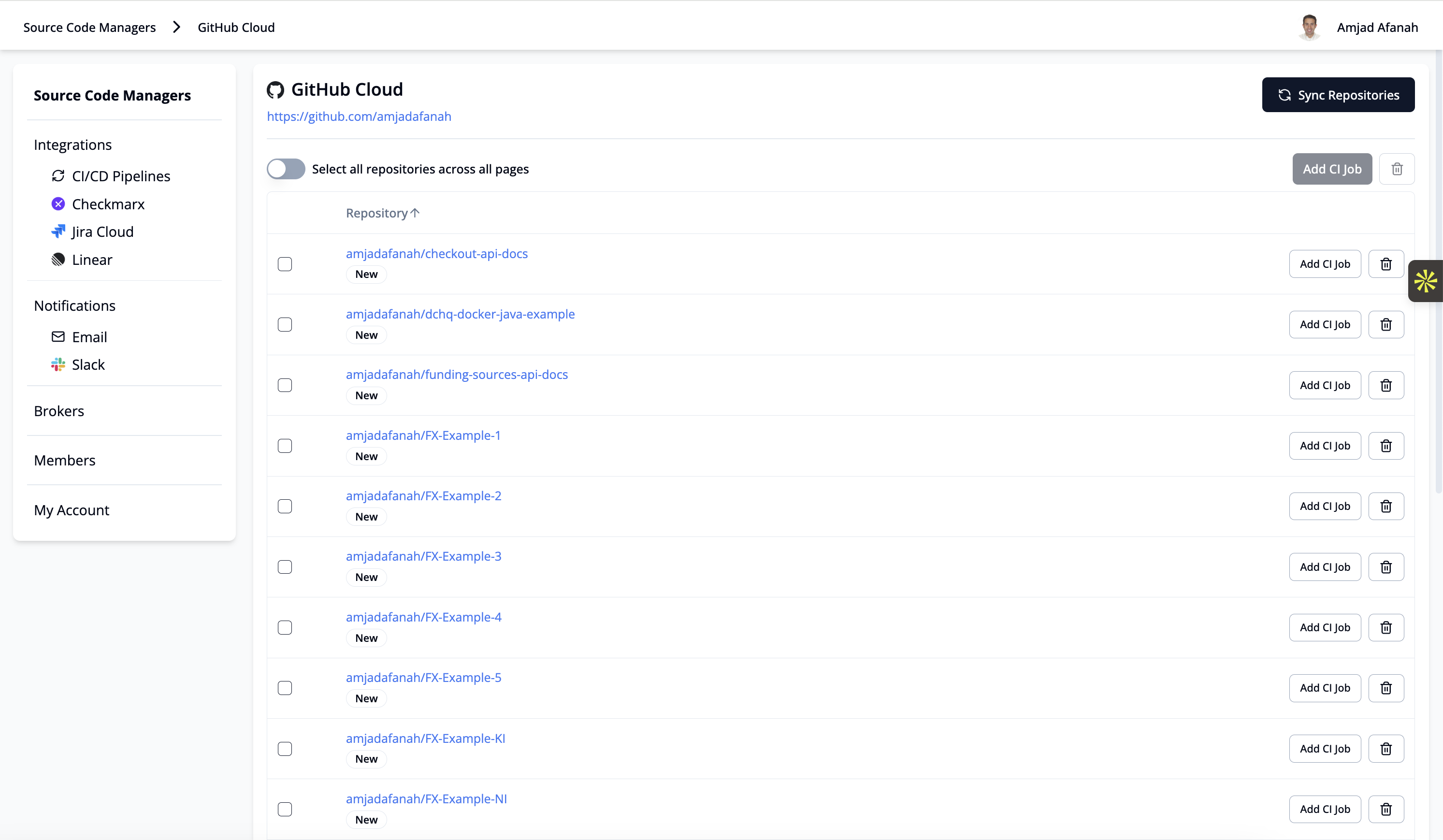 Once installed, all selected repositories will be imported into the HoundDog.ai Cloud Platform. From there, you can select all repositories by toggling Select all repositories across all pages, or choose specific repositories by clicking the corresponding checkboxes. After selecting the repositories you want to configure, click the Add CI Job button to automatically configure GitHub Actions and push the CI configuration as either a direct commit or a pull request requiring approval.