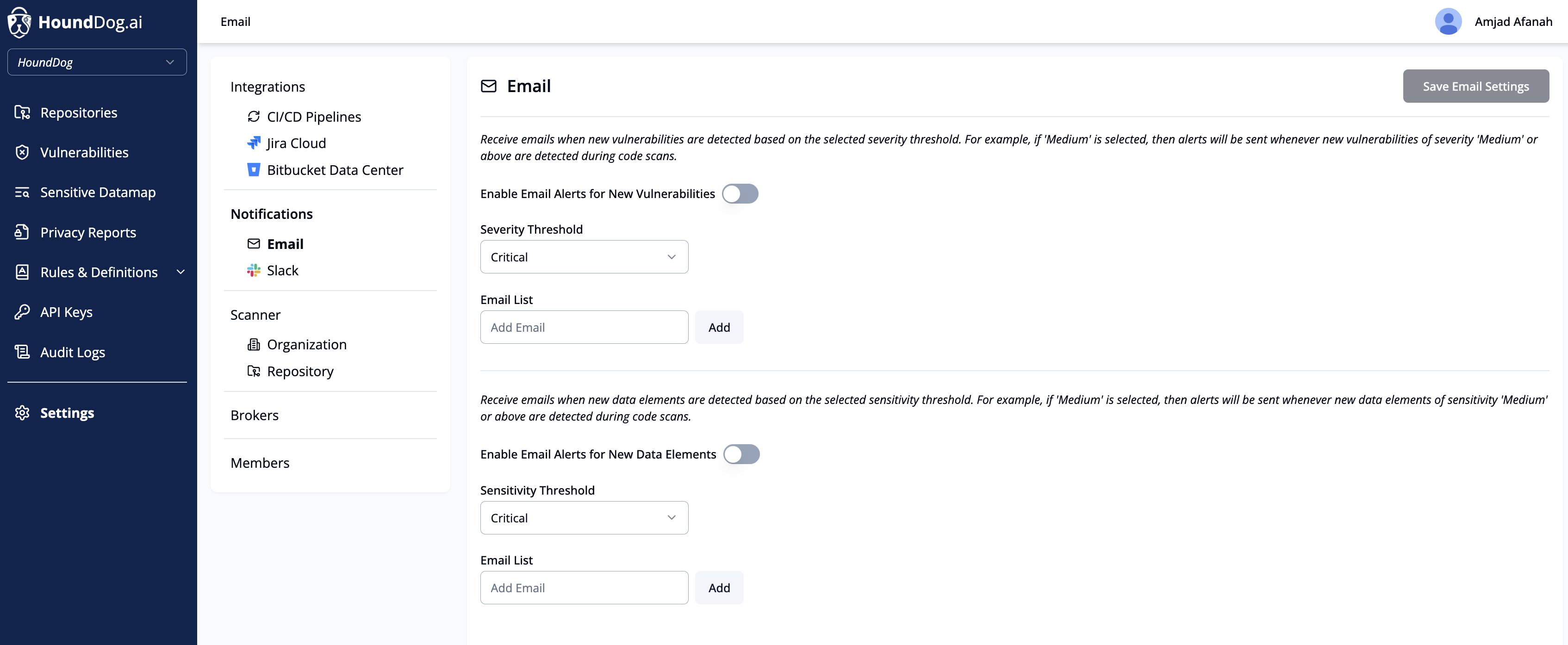 - Email: Enable notifications for new vulnerabilities or data elements detected based on their severity and sensitivity levels, respectively.
