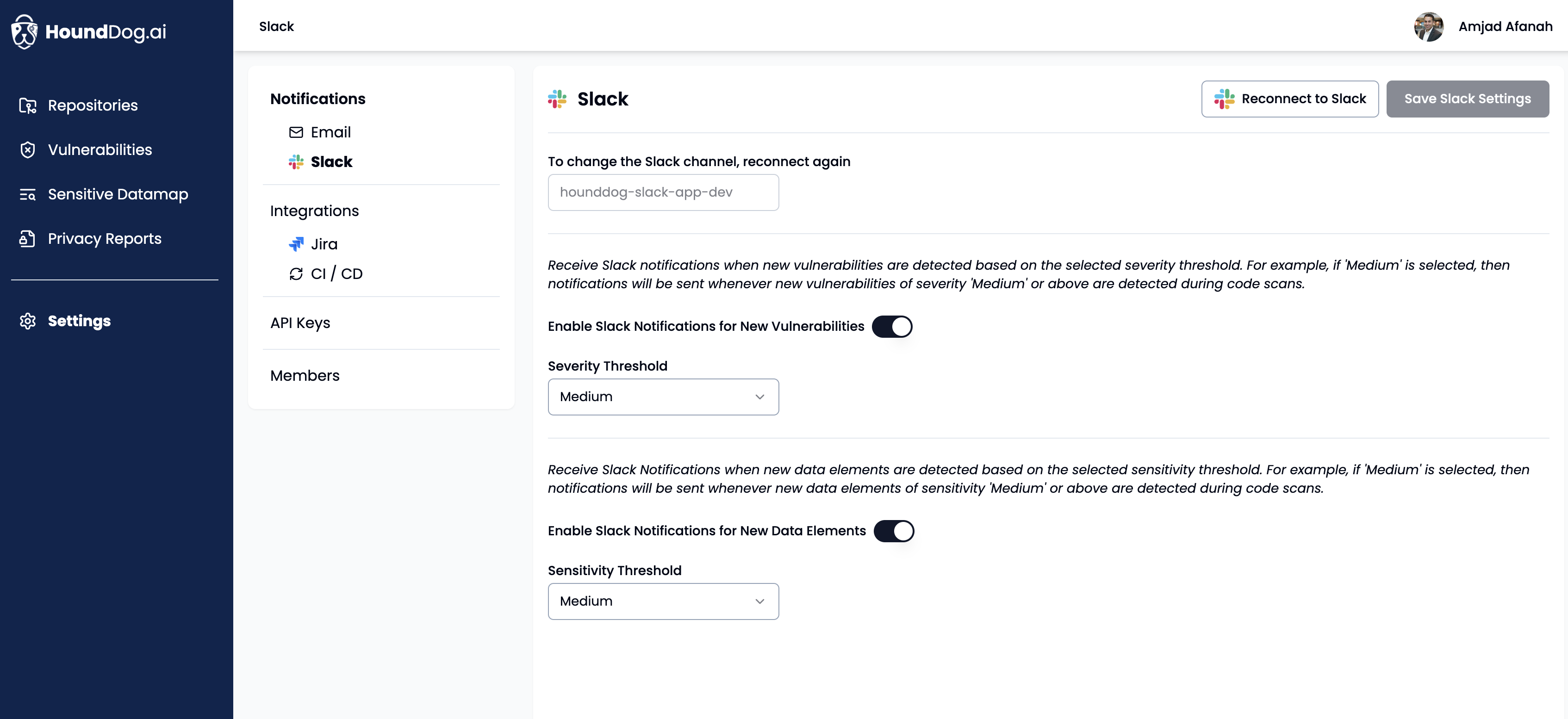 - Slack: Enable notifications for new vulnerabilities or data elements detected based on their severity and sensitivity levels, respectively.