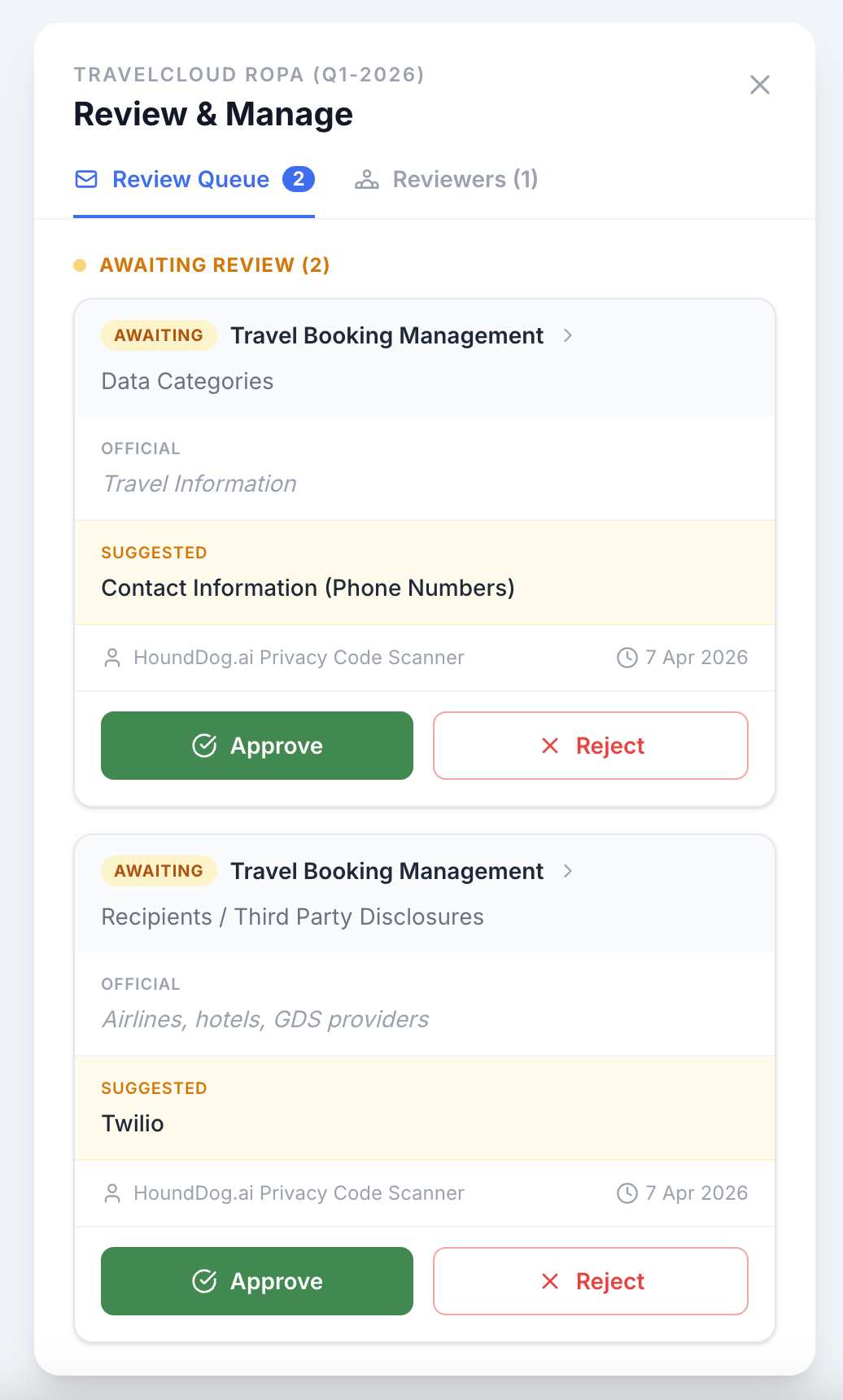 Review and approve updates submitted by teams or auto-suggested by the scanner. The DPO has full control over what gets applied to the Org RoPA.