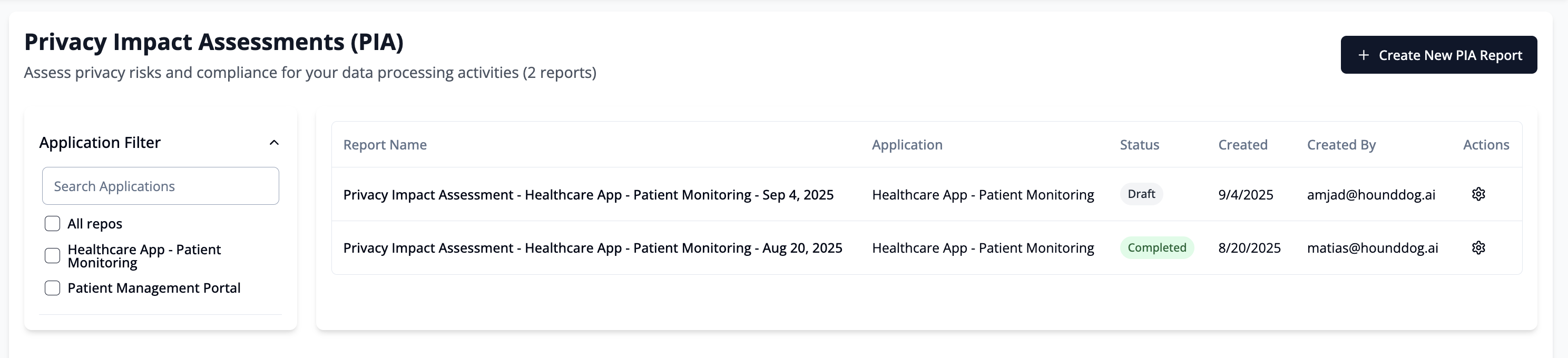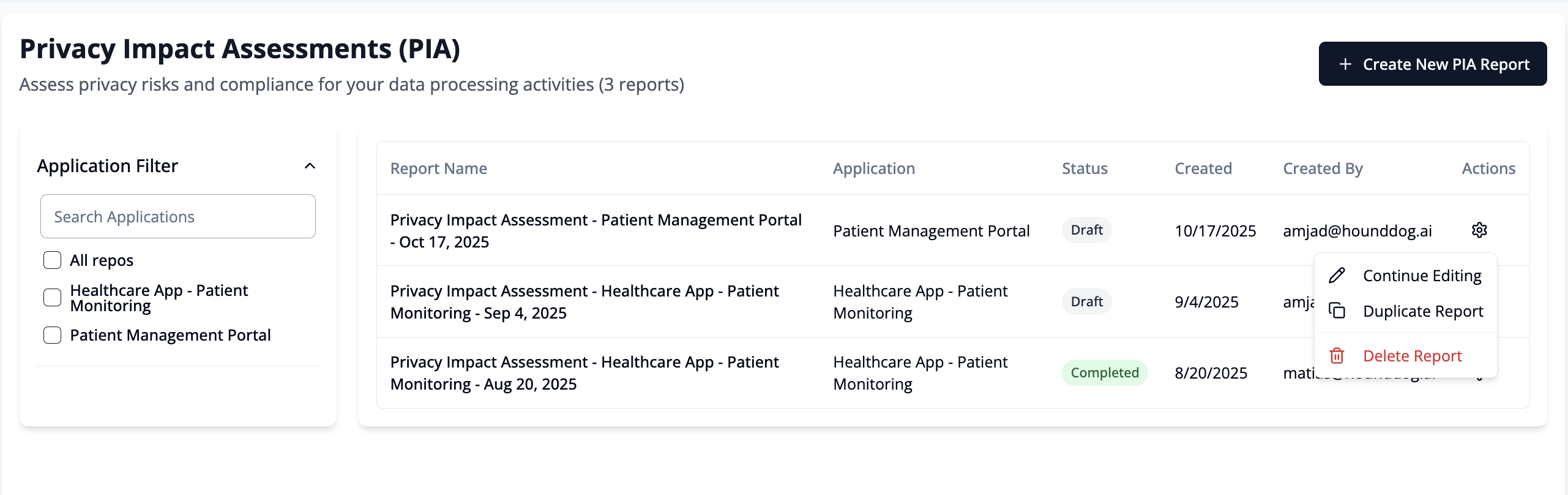 Additional features available for both RoPA and PIA reports include the ability to save a draft and continue editing later, delete reports, and duplicate existing reports.
