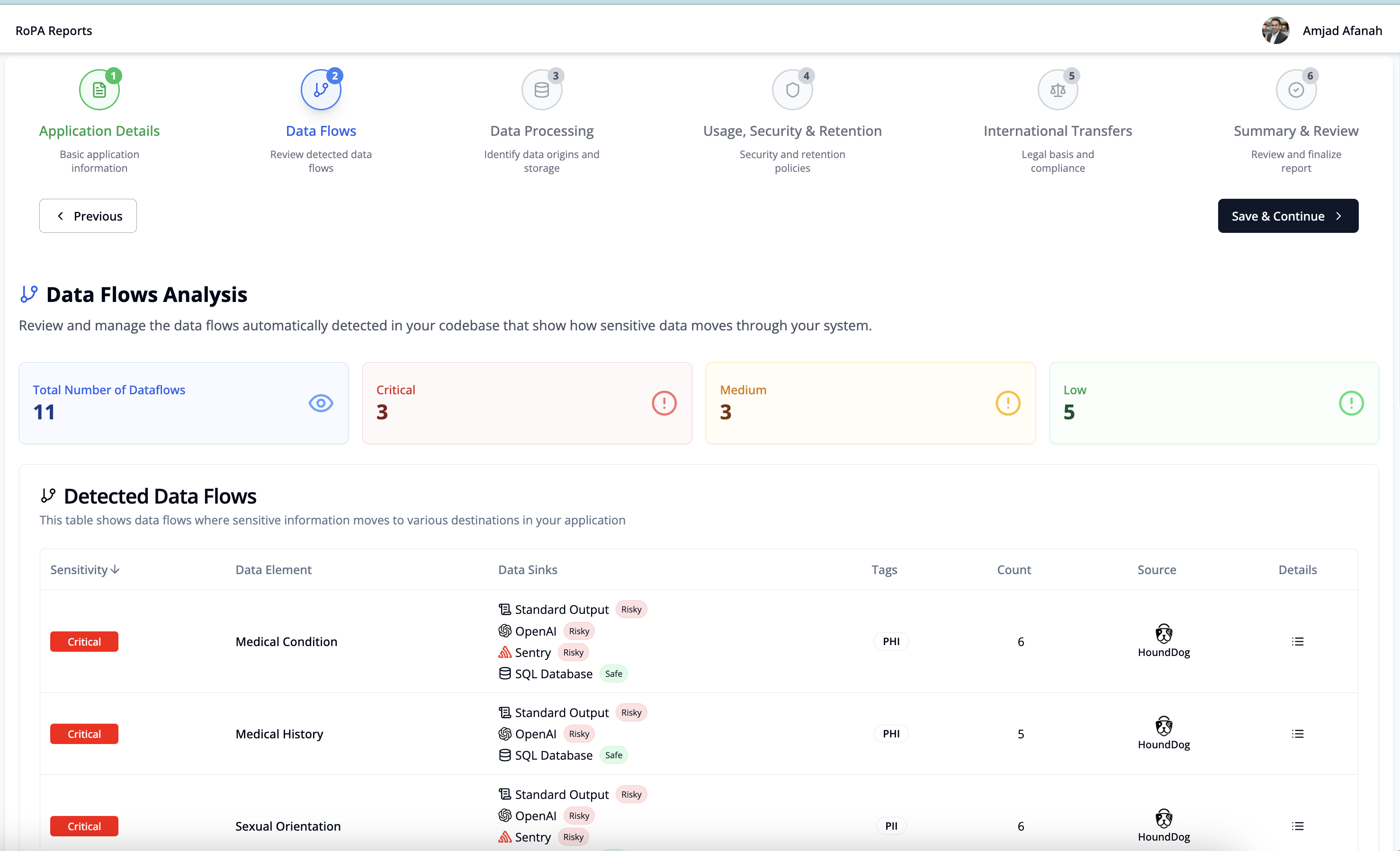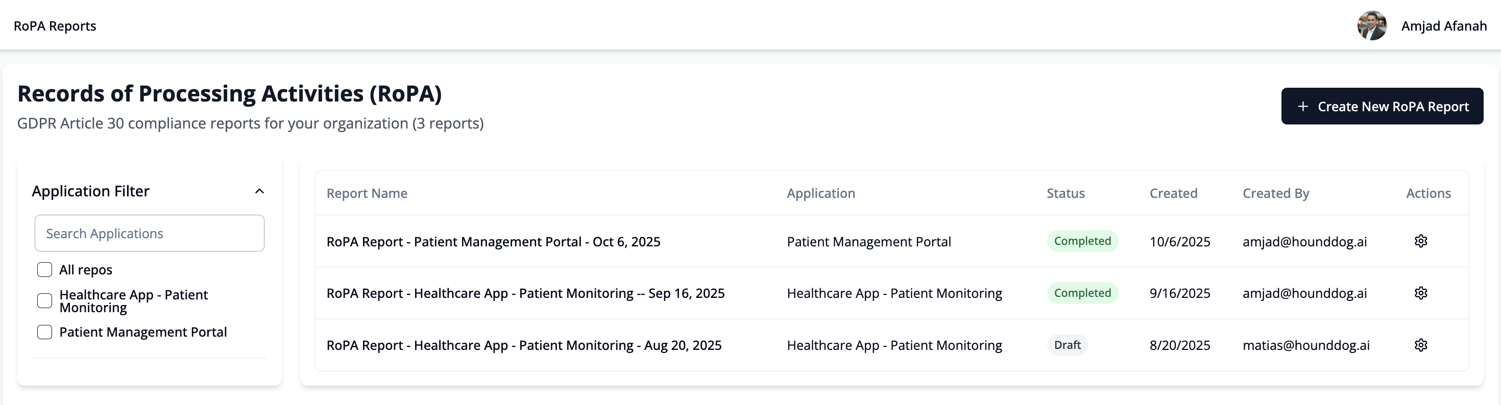 Next, you can create your Records of Processing Activities by clicking the Create New RoPA Report button. The self-guided workflow allows you to fill in information about the legal basis for processing data, your organization’s role in processing, the security controls in place, the data retention policy, and more. The section automatically populated by HoundDog.ai is the Data Flows part, which is arguably the hardest aspect of privacy compliance - especially when development moves quickly and privacy platforms miss hidden data flows to AI and third-party integrations.