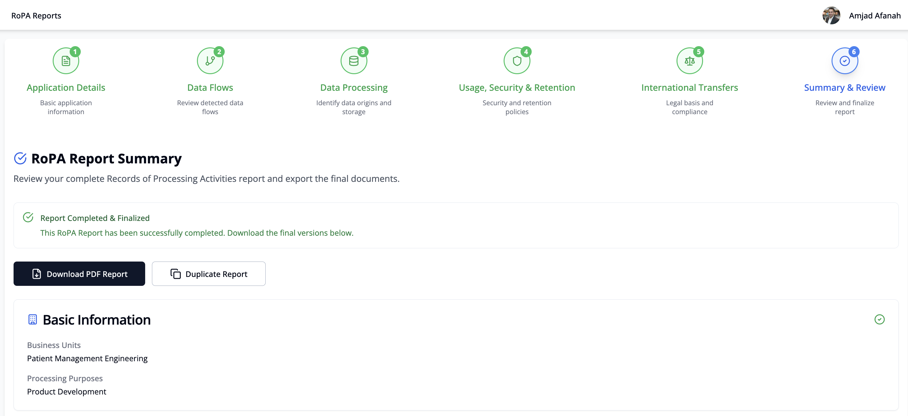 At the end of both RoPA and PIA workflows, you can download the reports in PDF format.