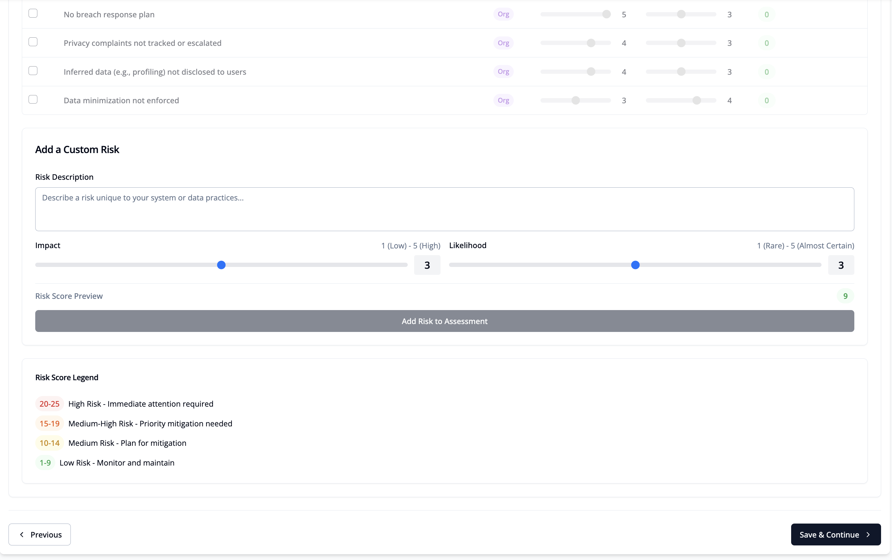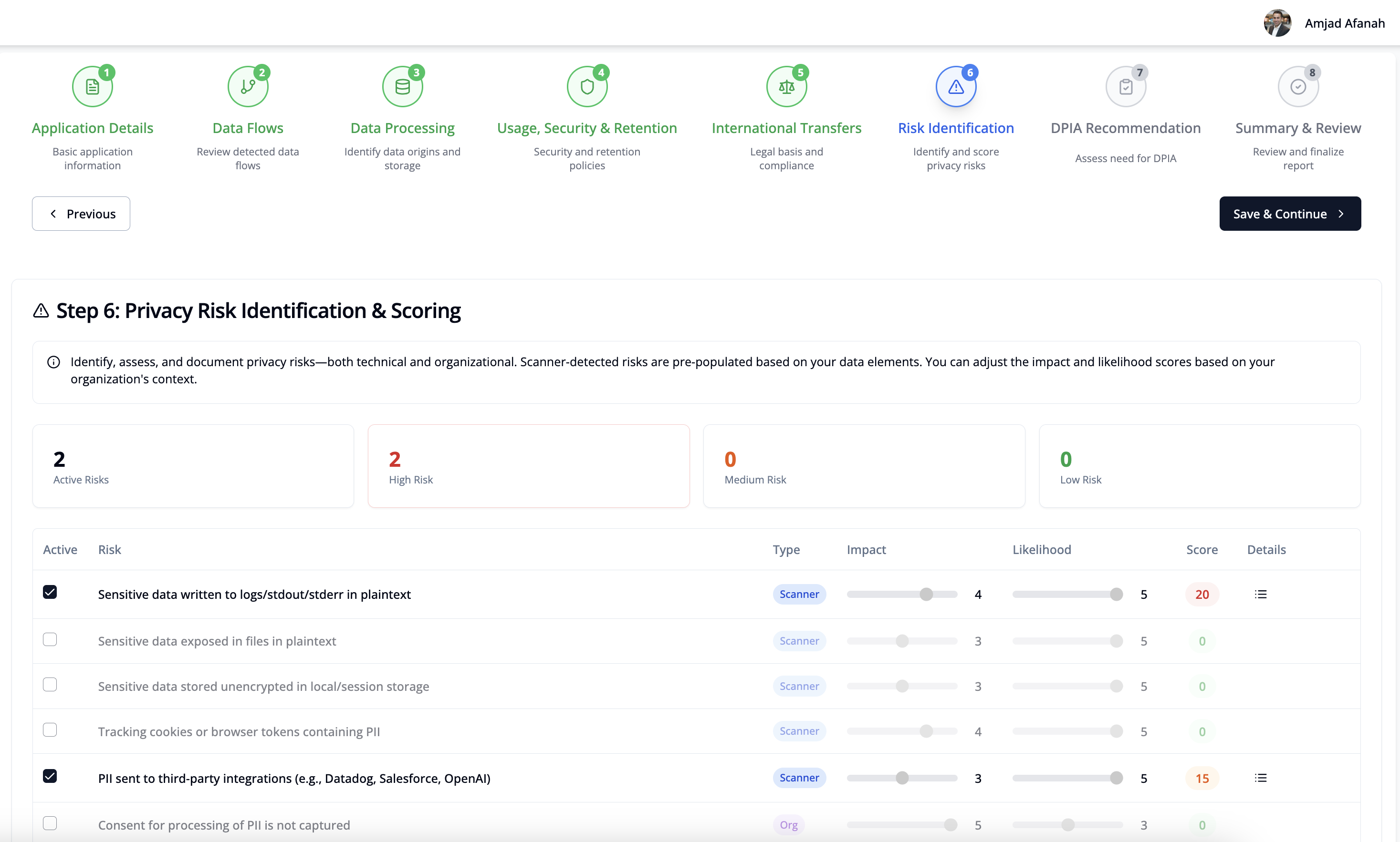 You can also create Privacy Impact Assessments by clicking the Create New PIA Report button. PIA overlaps with RoPA but also includes a privacy risks section. Based on the overall score of detected or declared risks, the report provides a recommendation on whether to proceed with a Data Protection Impact Assessment. Privacy risks detected by the HoundDog.ai scanner are automatically prefilled, giving you visibility into issues such as sensitive exposures in logs, local storage, or third-party SDKs. You can adjust the impact and likelihood scores for detected risks and add your own custom risks.