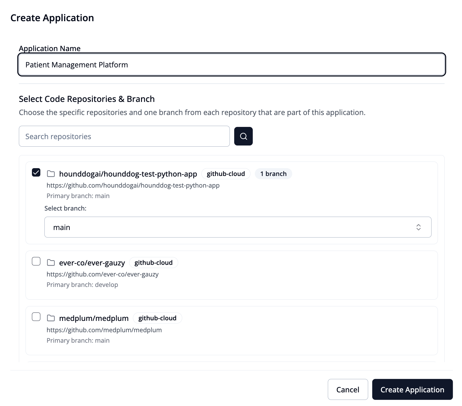 To get started, first create an Application, which can consist of one or multiple code repositories. For example, if an application is made up of three repositories - one for the backend, one for the frontend, and another for the authentication service - you can select all three to get a comprehensive view of all data flows within that application.
