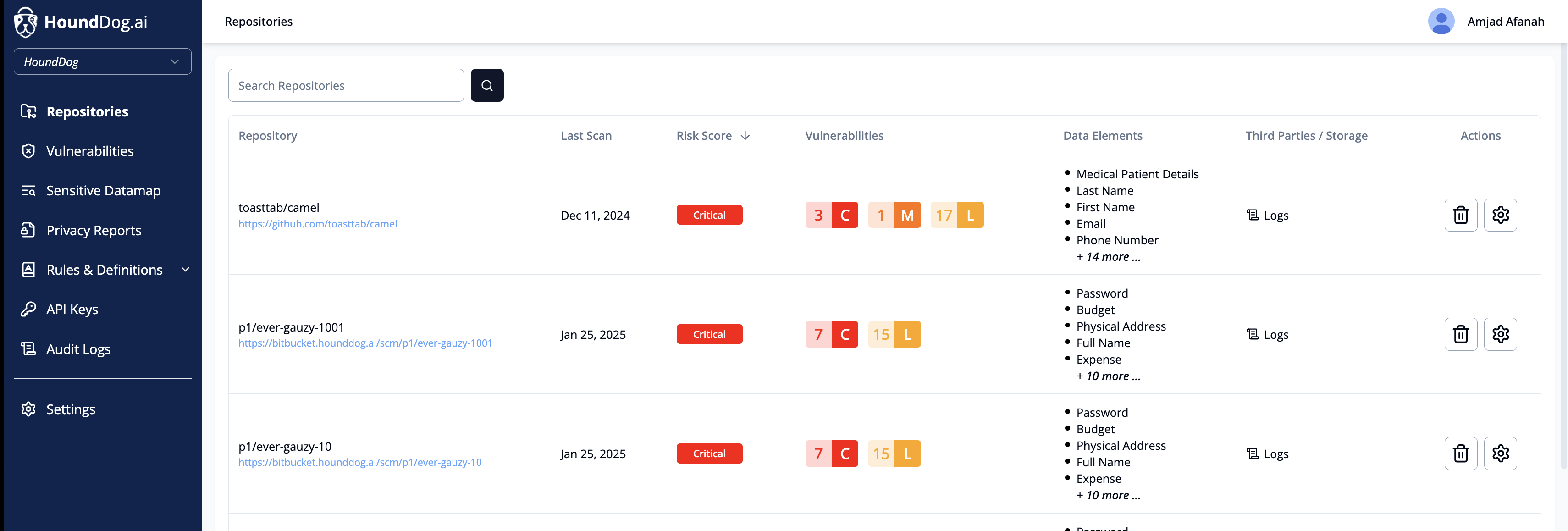 The Repositories page displays the number of vulnerabilities detected per repository, categorized by severity levels. You can drill down into the detected vulnerabilities by clicking on a vulnerability count link and access the sensitive data map for each repository through the Data Elements section. Additionally, each repository is assigned a "Risk Score" based on the sensitivity of the data being processed. For instance, a repository handling Social Security Numbers would be rated as critical due to processing highly sensitive data elements.