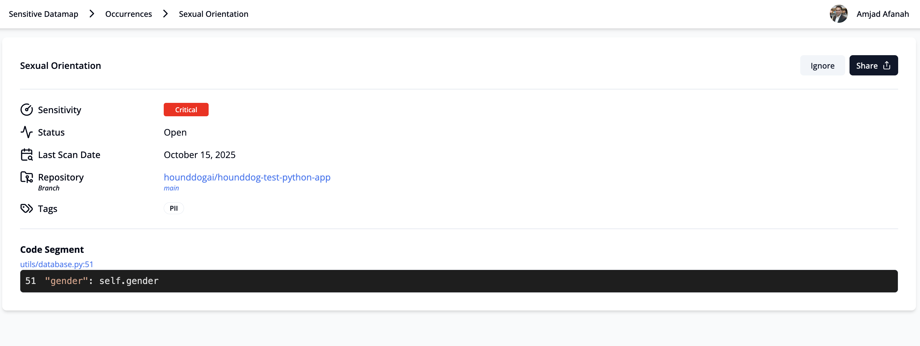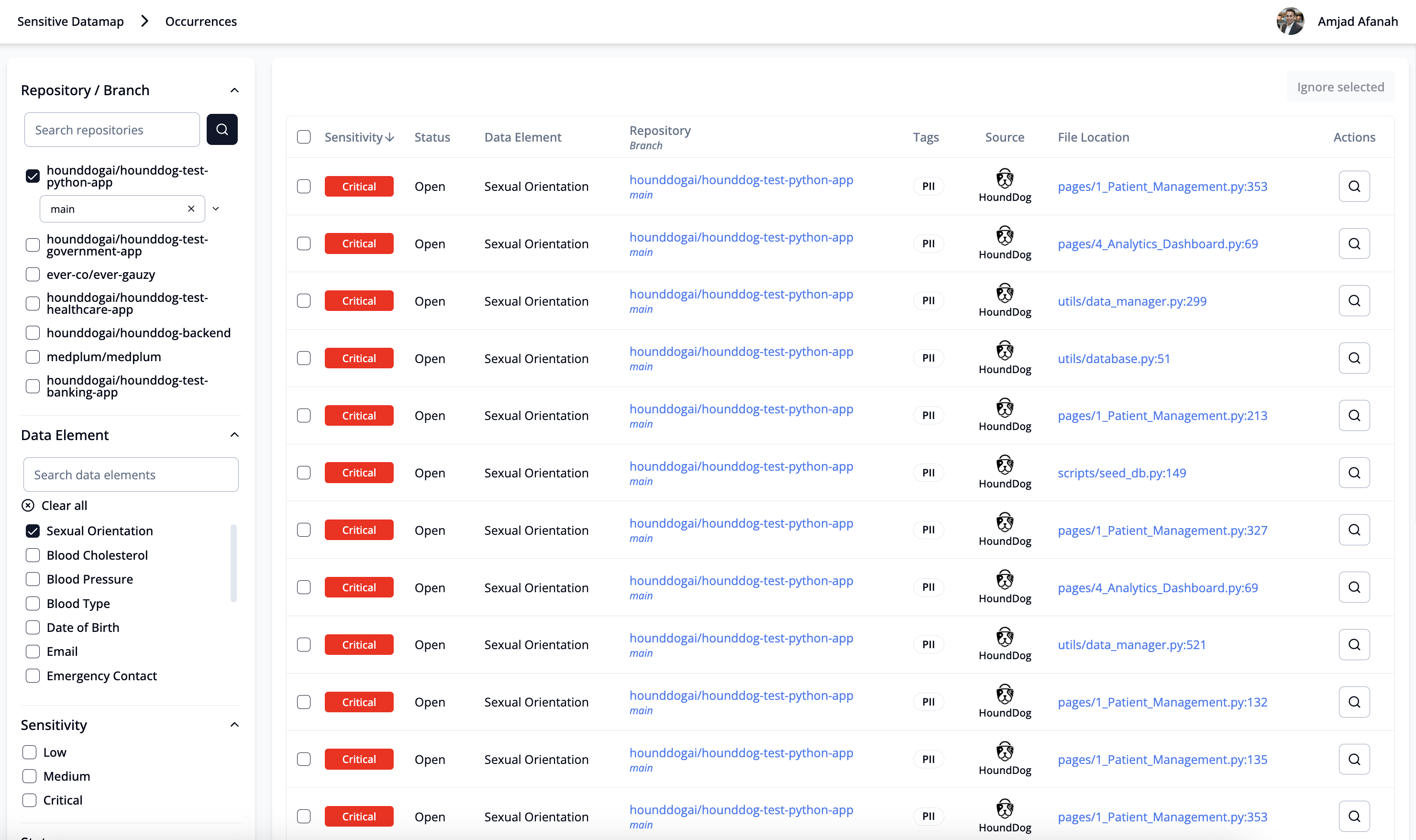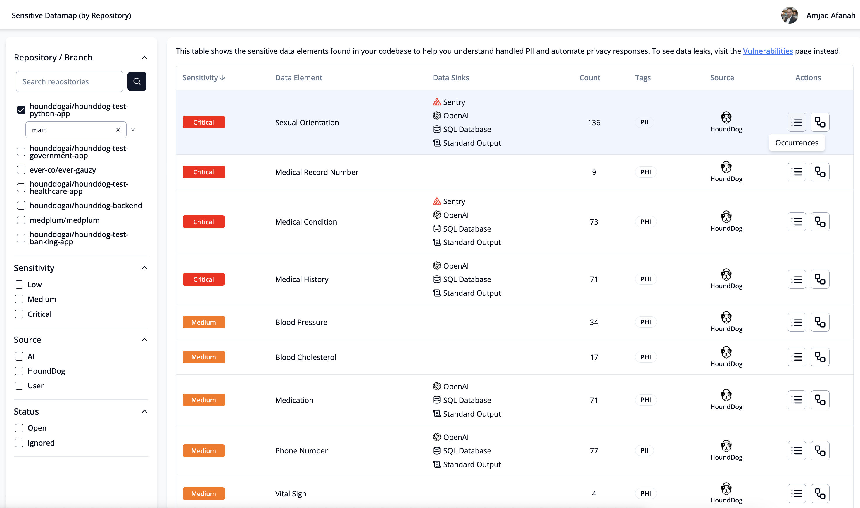 - Source (for example, HoundDog provided data element, user defined, or AI generated)