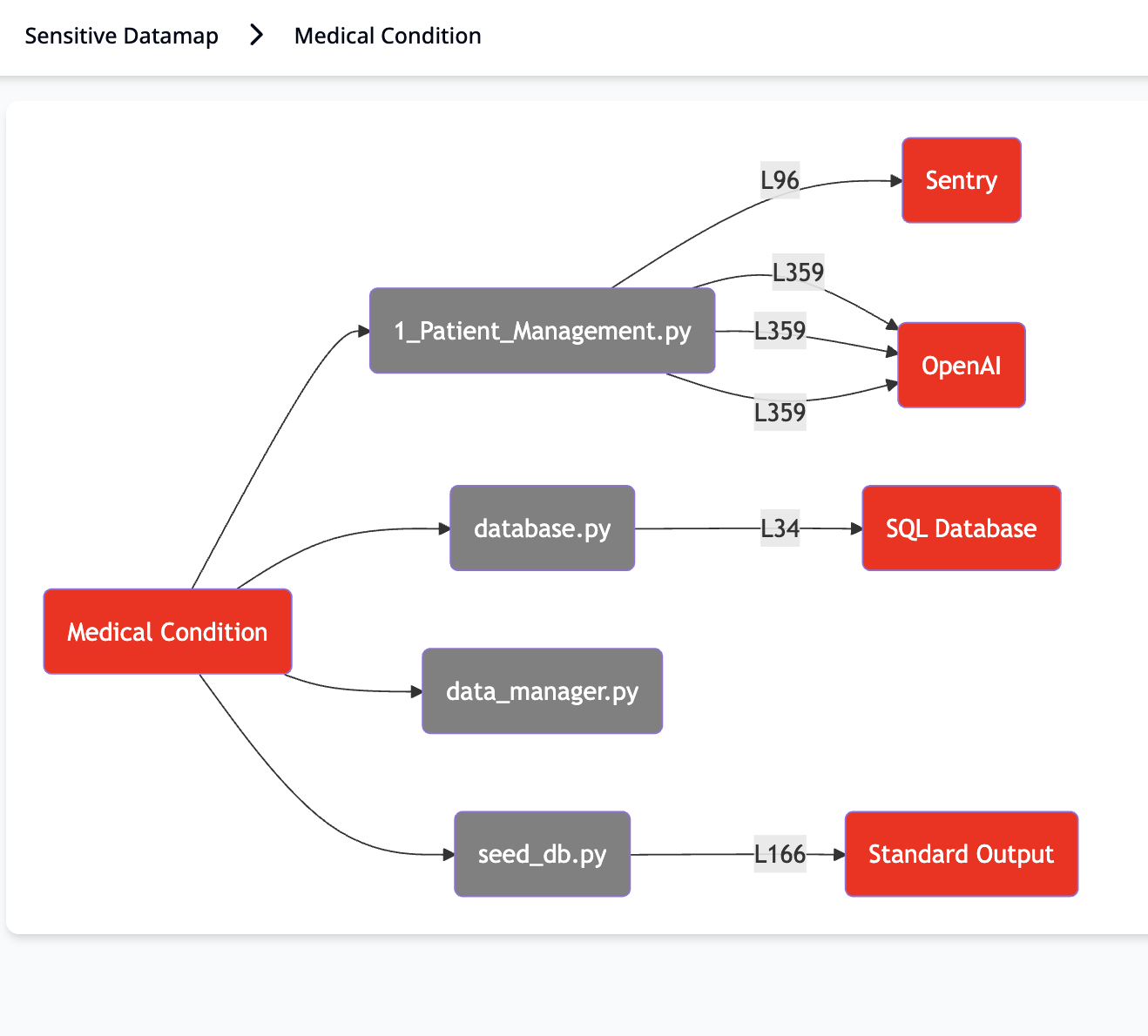 A sensitive data map displays sensitive data flows across all storage mediums, third party and AI integrations, including both safe and risky data sinks. This allows privacy teams to get a live view of sensitive data flows without waiting for app owners to fill out elaborate questionnaires with every new release, and most importantly, without missing hidden data flows to shadow AI and third party integrations that traditional privacy platforms typically miss.
