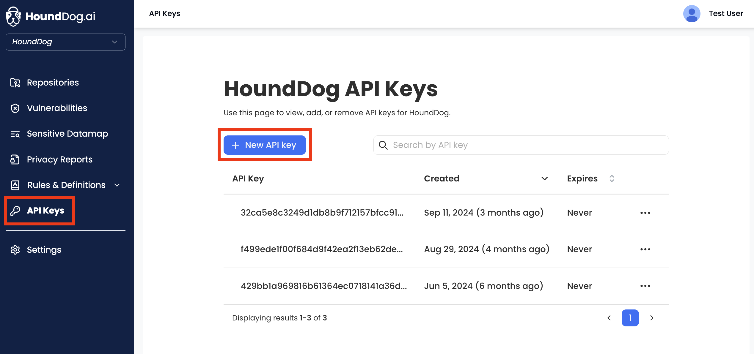 Log in to the HoundDog.ai Cloud Platform, navigate to the API Keys page, and click on the New API Key button to generate a new key: